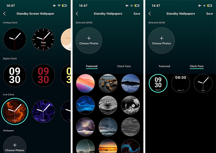 Léteznek „élő” stílusok is; ezek mind analóg (mutatós) órát használnak, és animált hátteret. Jelenleg 3 ilyen mozgó órastílus közül választhatunk. Ha saját háttérképet töltenénk fel, akkor kétféle digitális és egy analóg kijelzés társítható hozzá (lásd fentebb a jobb oldali képernyőfotón). Kijelző fényere lehet automatikus (a beépített fényszenzorral szabályozott) vagy 15 fokozatban állítható. Természetesen állandóan kikapcsolva is lehet, vagy kérhetjük azt, hogy csak lejátszás közben látszódjon: