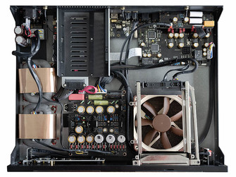 Az akár két belső HDD lehetősége miatt már szükség van az aktív hűtésre, amit egy extra halk, 120 mm átmérőjű Noctua ventilátor biztosít.